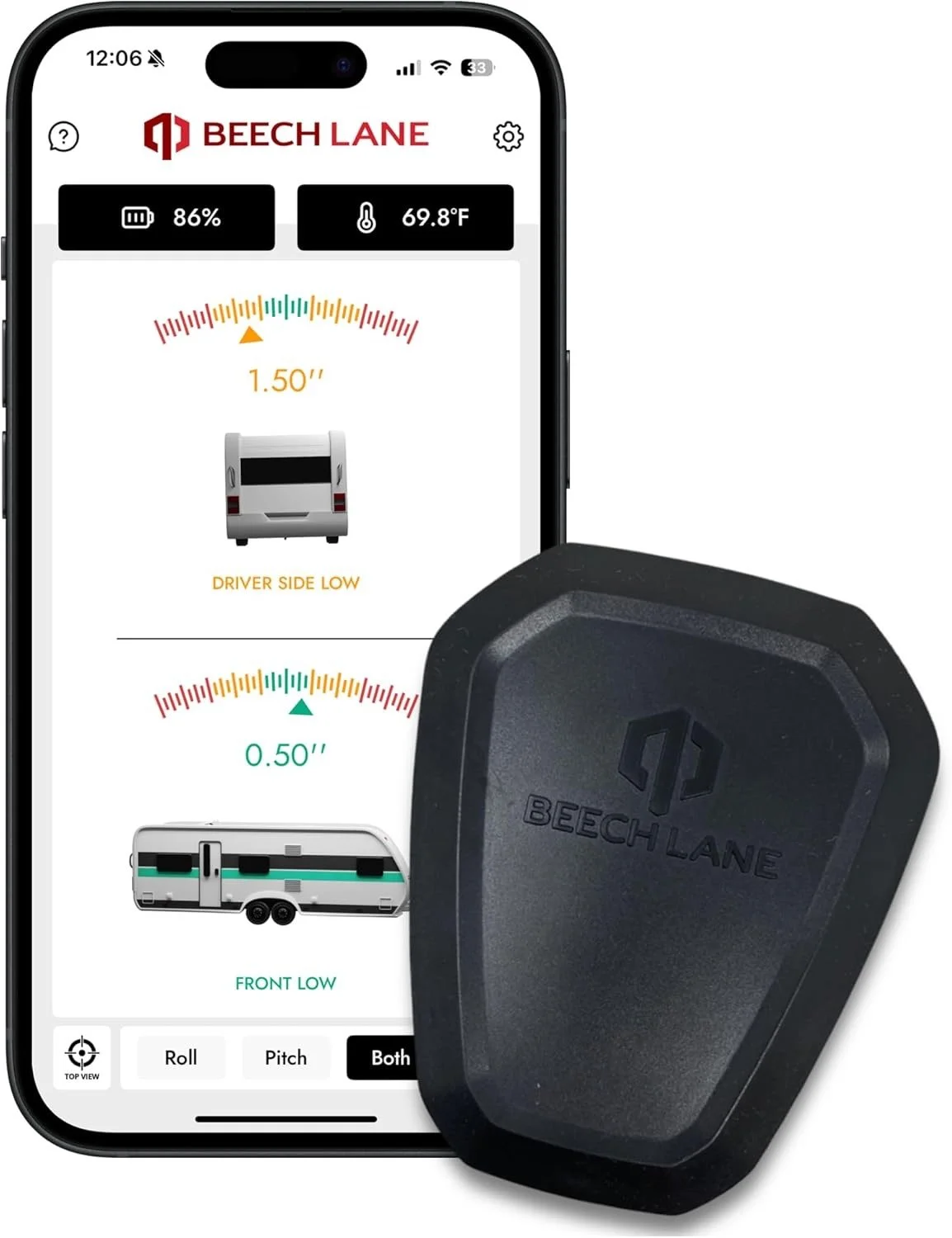 RV leveling system features a 3-axis digitial accelerometer that removes the guesswork and tells you exactly how level your RV is via the phone app