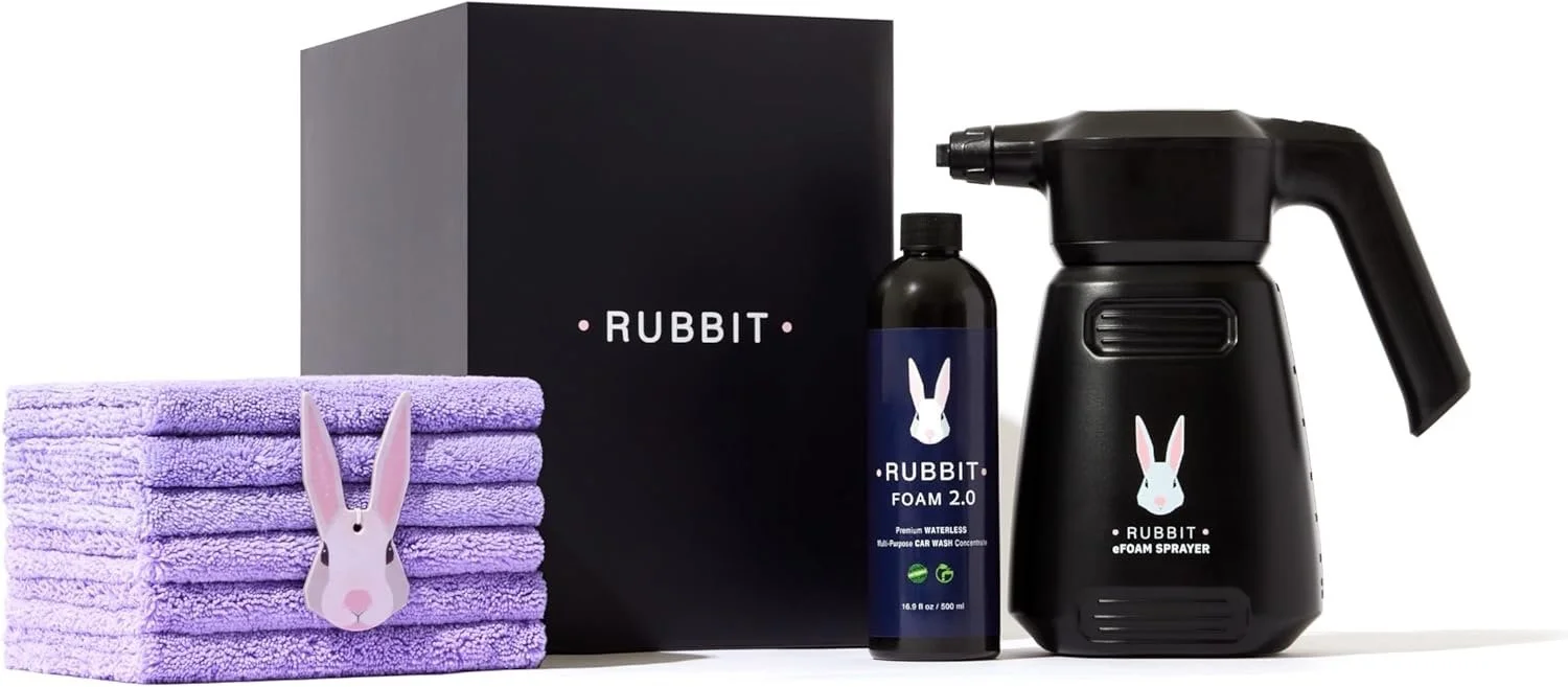 ALL-IN-ONE WATERLESS CAR CLEANING KIT: The Rubbit Electric Plus Kit includes everything you need for waterless detailing: a rechargeable electric sprayer, Rubbit Foam 2.0 concentrate (enough for 25 washes), 6 reusable microfiber cleaning cloths, and a fresh car air freshener. A complete car detailing kit for fast, effective, no-rinse exterior cleaning and touch-ups